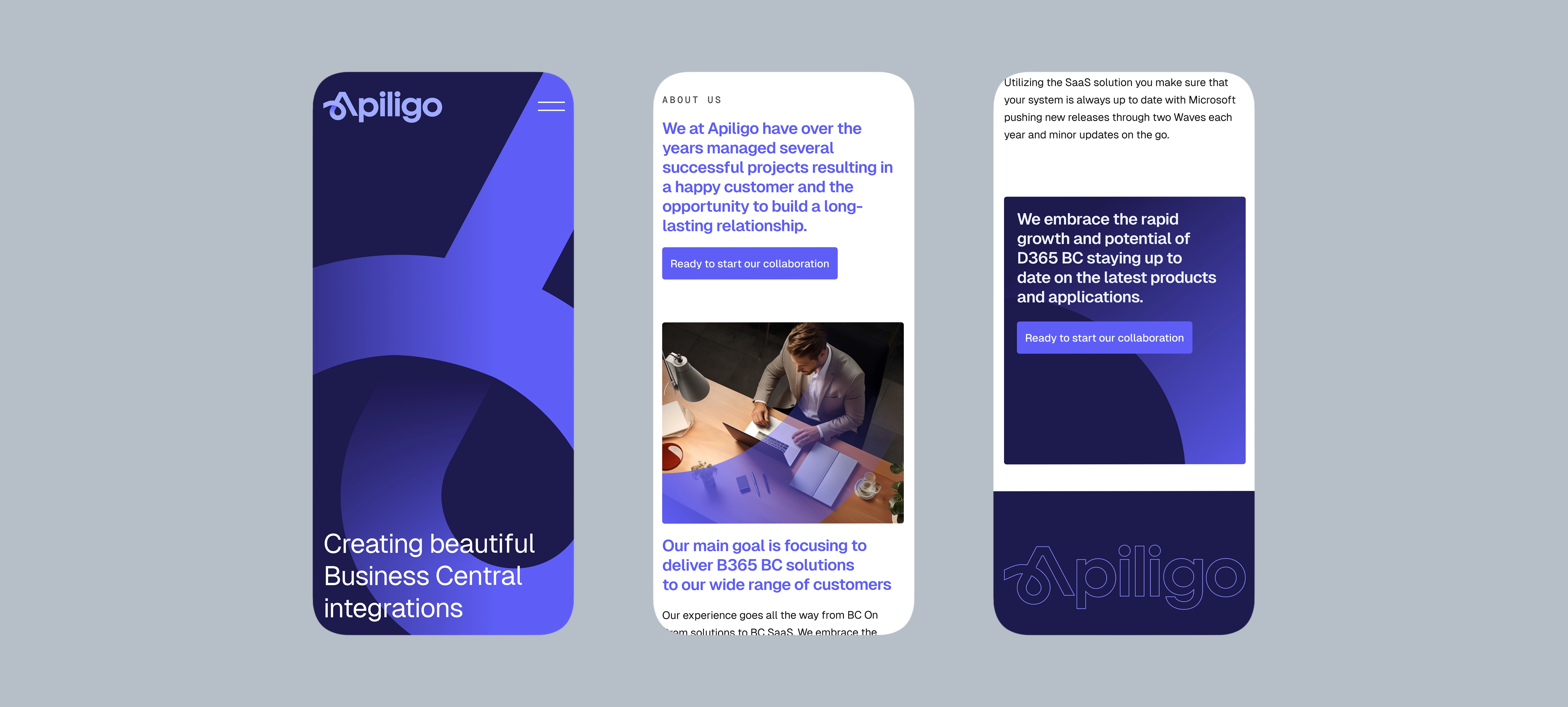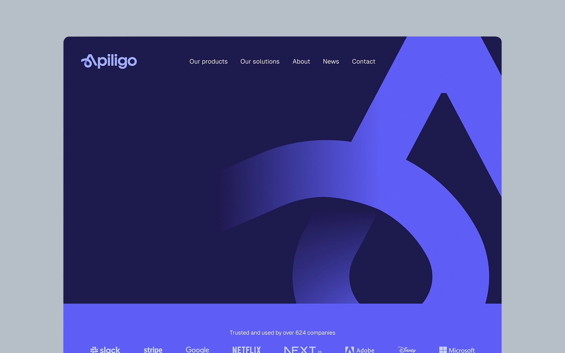 Apiligo is a B2B software company that delivers reusable, dynamic and extendible apps. The new logo expands on the meaning of the name: API + Logo (connection). This is emphasised by the loop detail in the letter A The word mark was also customised to create a unique structure. A detail of the logo is used as a main brand device. The visual brand included printed collateral, a responsive landing page design.